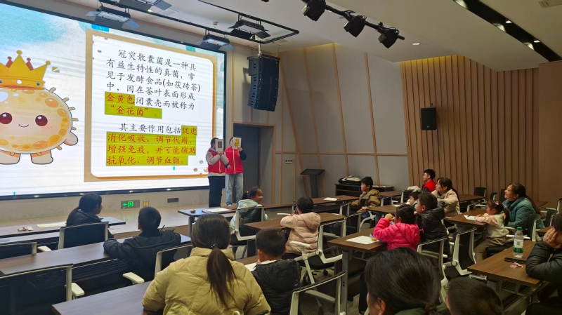 随后,探索进入黑茶制作的核心环节。孩子们沿着非遗工艺的脉络,从“炒锅杀青”到“七星灶烘焙”,逐步了解黑茶的诞生过程。课程重点解密了最为神奇的“渥堆发酵”阶段,将其比喻为一个微观世界里的精密工厂:黑曲霉作为“分解师”率先工作,用酶分解茶叶纤维;酵母菌作为“酿造师”接力,创造出丰富的芳香物质;而统领全局、造就茯砖茶独特金色斑点的,正是被称为“金花”的冠突散囊菌。这种益生真菌不仅赋予了黑茶标志性的色泽与风味,更被现代科学证实具有促进消化、调节代谢等多重健康价值,生动展示了传统智慧与当代生命科学的完美融合。