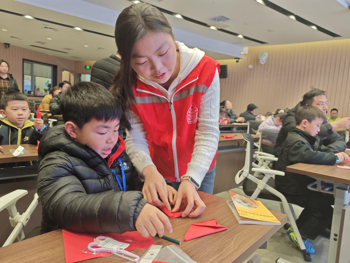 初七,文诗懿带来了一堂别开生面的“剪纸里的新年味”课程。她从“年”的传说到春节的习俗娓娓道来,一步步引导孩子们观察窗花里的对称美学。在随后的动手环节,她穿梭在家长与孩子之间,手把手教大家折纸、画样、下剪。当一张张红纸在孩子们手中变成灵动的生肖马、吉祥的福字时,传统文化的魅力也在指尖流淌。“作为一名工科生,逻辑与精准是我们的追求,但科学与文化的结合,能让知识更有温度。”文诗懿表示,能用青春热情服务家乡,在实践中增长才干,是这个寒假最充实的收获。