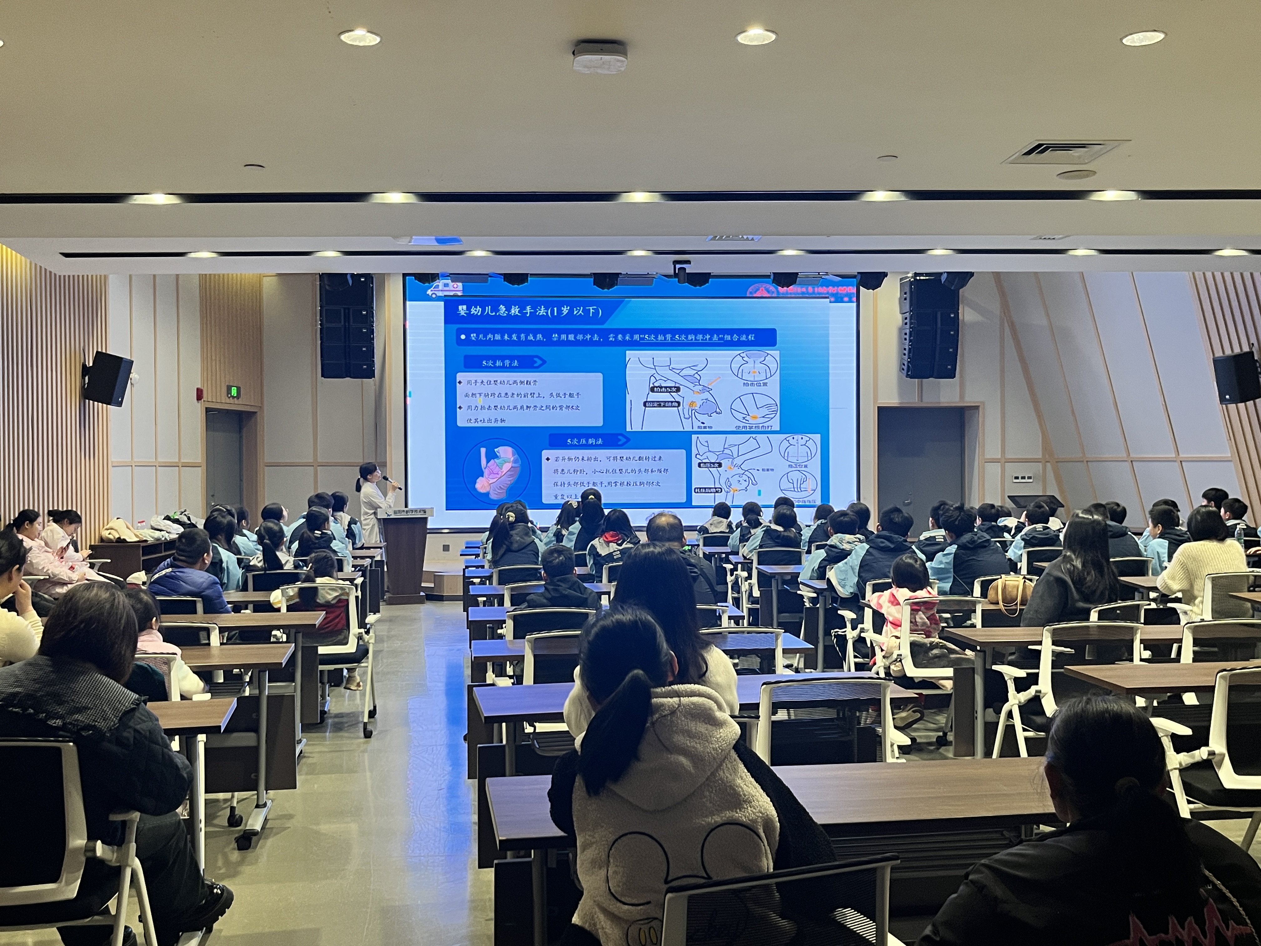 海姆利希法的教学环节同样令人印象深刻。“如果看到有人吃东西噎住,双手这样环抱,向上向内用力冲击。”医生用模型分别演示了成人与儿童的不同操作手法。一位男生自告奋勇上台体验,在医生手把手的指导下完成了一次完整操作,虽然动作略显生涩,但流程清晰、要点到位,赢得了在场同学的掌声。