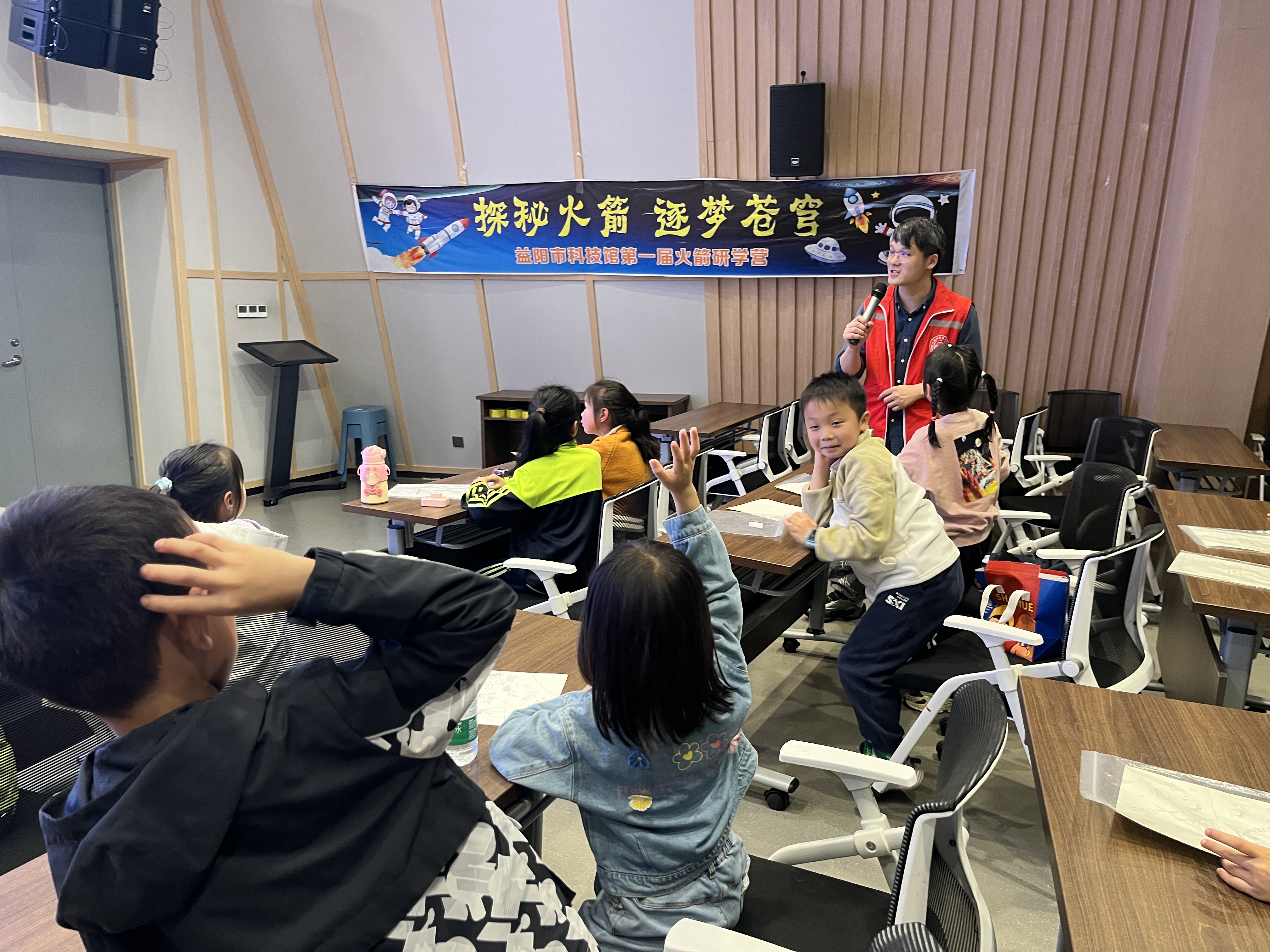 作为火箭研学营的第一课,《走进太空“飞毛腿”》带领小学员叩开航天大门。老师用生动的比喻讲解火箭结构,孩子们争先恐后回答问题,并亲手绘画火箭,航天梦想悄然种下。