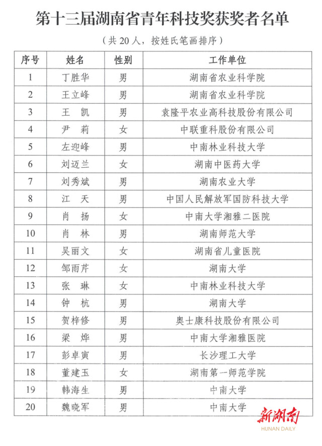 为引导激励我省优秀青年科技人才脱颖而出,持续激发青年科技人才创新创造活力,加快实现“三高四新” 美好蓝图,经省委、省政府批准,省科协组织开展了第十三届湖南省青年科技奖评选表彰工作。经“两审三公示”,决定授予丁胜华等20名同志第十三届湖南省青年科技奖。