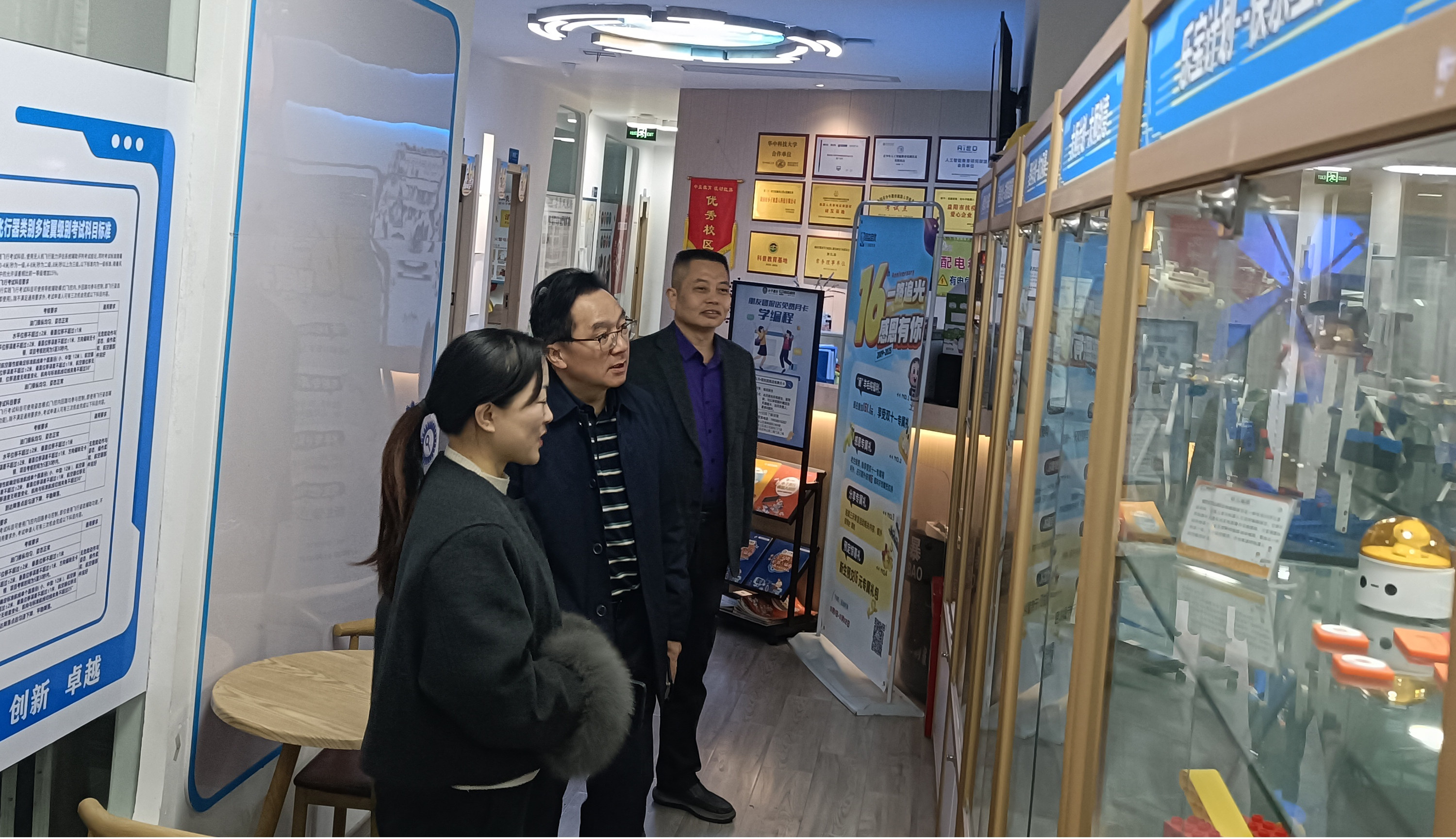 刘炼真一行在机构负责人唐老师的陪同下,参观教育中心各教室,详细了解乐高创意启蒙、代码编程(Python、C++)、机器人、无人机项目以及信息学奥赛培训等科技课程。