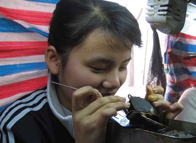 沅江市珍珠产业协会成立于2002年5月, 有分会8个,会员226名,下设“洞庭珍珠开发责任有限公司”。协会成立以来,运作优良,发展迅速, 仅用短短一年多时间,发展珍珠养殖水面32000亩,拥有资产8000多万元,具有繁殖4000万只以上珍珠材料蚌的年生产能力,已成为中南地区最大的珍珠生产科普示范基地和全国珍珠种蚌的聚散中心。图为育珠姑娘在紧张地劳动。(摄影 杨宏斌)