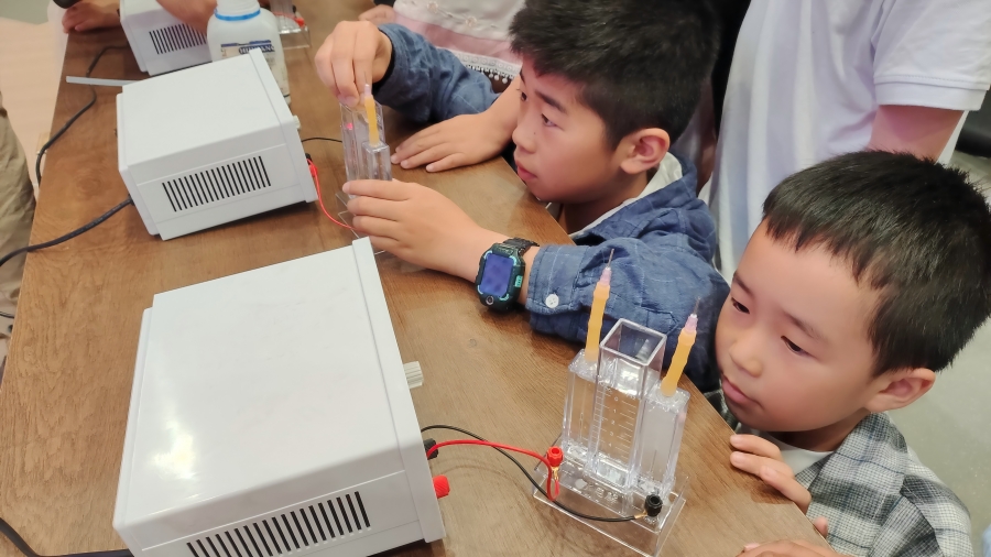 上午,科技馆内的电解水实验秀成为全场焦点。小朋友们满怀着好奇与期待,在工作人员的悉心引导下,亲自动手操作实验设备。当电流通过,水分子被神奇地拆解,氢氧气泡欢腾升起,现场瞬间响起一片惊叹。一位小朋友兴奋地喊道:“太神奇了,原来水还能变成这样!”这一实验不仅展现了科学的奇妙,更让孩子们深刻领悟到,每一项科学成就的背后,都离不开科学家们的辛勤付出与智慧探索,正是他们的不懈劳动推动着科学不断进步。