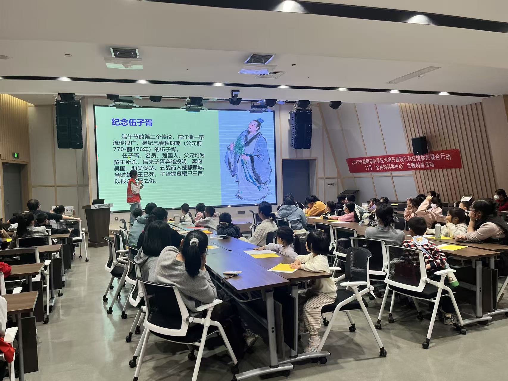 课堂伊始,科普志愿者老师为大家介绍了龙舟——凝结了千年智慧与审美的重要非遗载体,并用生动的语言描绘龙舟的“形”与“魂”:昂扬的龙头是精神的象征,狭长的船身体现了流体力学与工艺美学的结合,上翘的龙尾则传递着灵动与力量。这种直接切入技艺核心的讲解,瞬间点燃了孩子们对传统造物智慧的好奇。