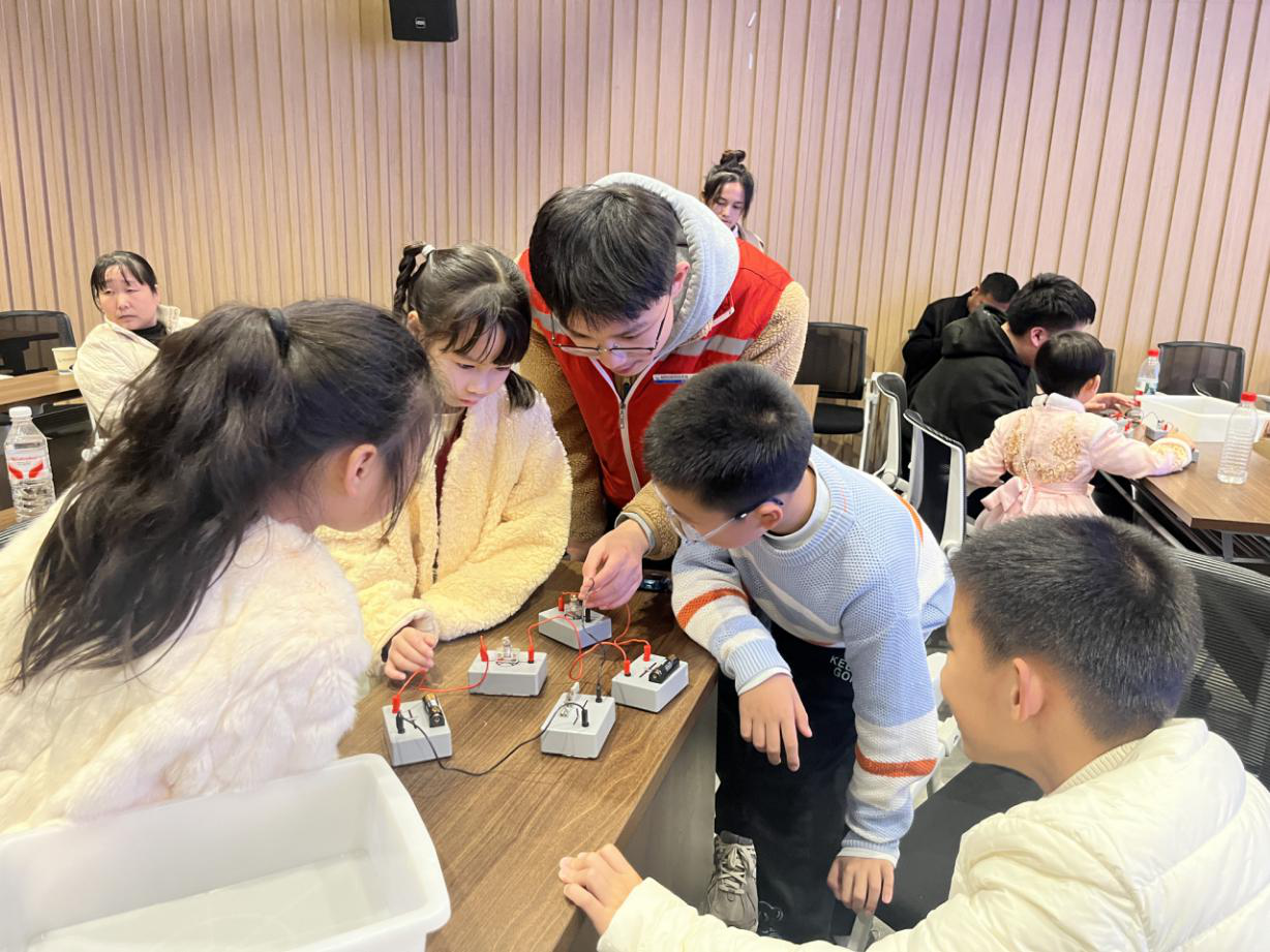 初六,唐肇南以“串联接福”为主题,化身科普老师。“汽车的车灯为什么总是两边一起亮呢?”“如果教室中其中一个灯坏了,其他灯还能亮吗?”他通过贴近生活的提问,迅速抓住了孩子们的好奇心。“一个能正常工作的电路,就像一个齐心协力的团队。”唐肇南用生动的比喻,将复杂的电路知识拆解为“团队的四名关键成员”:能量之源-电源、电流通道-导线、能量转换-用电器、控制中心-开关。在他的指导下,孩子们动手拿起两个电池盒、小灯泡和开关,在一次次接线与观察中,亲手点亮了属于自己的“新春第一盏灯”。在动手探索的欢笑声中,科学的种子悄然萌芽。